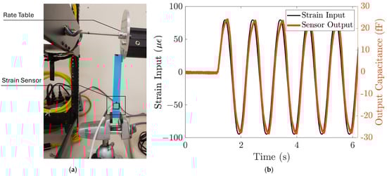 The response of the strain sensing system to dynamic loads is characterized using the strain induced by a rate table. The strain sensing system is first bonded to the cantilever beam, similar to the static characterization setup. Then, the end of the cantilever beam is attached to the edge of the rate table, clamped by two metal plates, as shown in Figure 6a. A sinusoidal function is commanded to the rate table, with an amplitude of 0.36 degrees and a frequency of 1 Hz. The strain input to the sensing system can be calculated from the displacement using (5), and the displacement at the end of the cantilever, , is the radius of the rate table multiplied by the angular position of the rate table. The angular position of the rate table is read by the rate table’s embedded sensor. This corresponds to a sinusoid strain input with an amplitude of 78 µε. We can then plot the input strain as a function of time. Figure 6b shows that the strain sensor output closely follows the strain input with high repeatability. The strain sensing system’s sensitivity to the dynamic input strain is ~300 aF/µε, which agrees with the static characterization result.