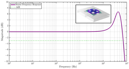 The sensor frequency response is also studied using COMSOL as shown in Figure 7, showing a flat gain bandwidth of greater than 10 kHz. A Q of 10 was assumed in the simulation, which causes peaking in the frequency response. The inset shows the first eigenmode of the strain sensor at 46.3 kHz.