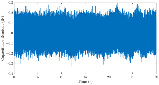 Three major noise sources, the Brownian noise of the MEMS sensor, the electronic noise of the ASIC, and quantization noise, limit the resolution of the strain sensing system. To characterize the resolution of the strain sensing system, the sensing system output is recorded for 30 s using the data processing hub without signal input. The result in Figure 8 shows a sensor noise of ~400 aF. This corresponds to a strain sensing resolution of 1.26 µε.