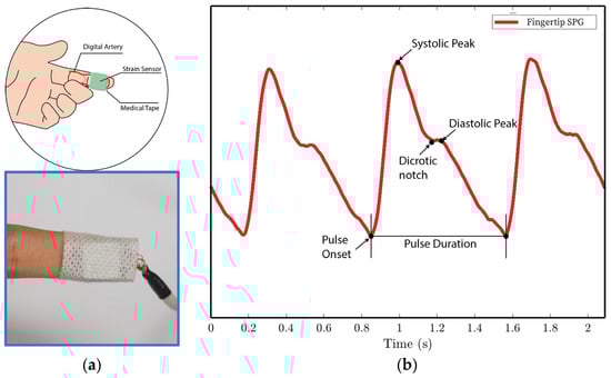 Figure 10. SPG signals are collected from the fingertip pulse location for experiments 1 and 4. (a) Illustration of sensor placement at the digital artery of the fingertip. Medical tape is used to attach the sensor to the fingertip. (b) SPG signal collected from the fingertip possesses the key features of the PPG signal. - In experiment 2, the MEMS strain sensor is placed on the wrist and fixed with medical tape, as shown in Figure 11a.