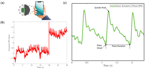 Figure 12. SPG signal is collected using the strain sensor attached to the cell phone for experiment 3. (a) Illustration of collecting the pulse signal from the digital artery at the fingertip by holding the cell phone with the strain sensor attached to the side. (b) Baseline drift due to the gripping force variation. (c) SPG signal collected preserves the shape and some features of the pulse waveform.