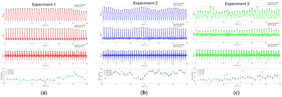 Experiment results for HR and HRV estimation. The HR and HRV for each experiment are reported on the top right of each subplot for each modality. (a) HR estimation using the SPG signal collected from the fingertip for experiment one. (b) HR estimation using the SPG signal collected from the wrist for experiment 2. (c) HR estimation using the SPG signal collected from the strain sensor attached to the cell phone.
