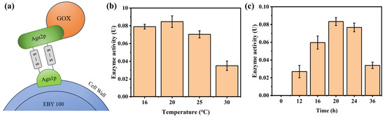 (a) Schematic representation of the yeast surface display system GOx; (b) Optimization of different induction temperature conditions (induction time of 24 h); (c) Optimization of different induction time conditions (induction temperature of 20 °C).