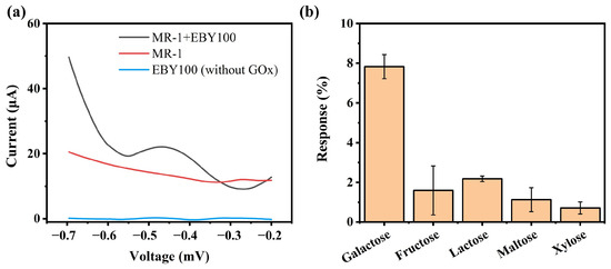 First, differential pulse voltammetry (DPV) was used to electrochemically detect the glucose response behavior of the bioelectroactive hydrogel sensor to verify the feasibility of the sensor. Figure 3a shows the DPV detection results of glucose solutions using different capillary hydrogel sensors. It can be observed that the hydrogel electrodes formed by the engineered strain EBY100 and MR-1 exhibited a distinct oxidation peak near −0.4 V, which is related to the oxidation of glucose by GOx on the electrode. In contrast, no noticeable oxidation peak was observed for the sensor constructed with MR-1 and the uninduced engineered strain. The specificity of the sensor was also analyzed. Common monosaccharides and disaccharides, including galactose, fructose, lactose, maltose, and xylose, were used as interfering substances. The same electrochemical detection method was applied to measure the oxidation current peak at −0.4 V, and the interference effects on the detection were analyzed by evaluating the size of the oxidation current peak. The results, shown in Figure 3b, indicate that the oxidation current peaks for galactose, fructose, lactose, maltose, and xylose near −0.4 V were 7.8% to 0.7% of the current peak observed for glucose detection. This demonstrates the enzyme’s substrate catalytic specificity and also confirms the feasibility of using bioelectroactive hydrogel-based sensors for electrochemical detection.