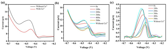 (a) Detection results of the bioelectric activity sensor before and after adding Cu2+; (b) Detection results of the sensor at different time points after adding Cu2+; (c) Analysis results after subtracting the background current.