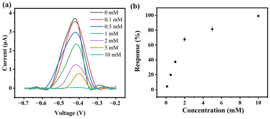 The stability of the bioelectroactive hydrogel sensor was investigated. As shown in Figure 6a, after storing the sensor at 4 °C for 5 days, it was still able to achieve over 90% of the current suppression rate. After storage for more than 6 days, the current response remained at 80%, and the detection performance began to decline significantly. This indicates that the detection platform has excellent storage stability, allowing for storage up to 5 days while maintaining reliable detection responses. Further investigation was conducted on the operational stability of the sensor. As shown in Figure 6b, after six consecutive uses, the sensor’s current output remained at a high level, with the response performance maintaining around 90%. After nine consecutive detections, the response decreased to approximately 70%. The sensor exhibited a significant performance decline after six detections, which may be attributed to the irreversible effect of Cu2+ on the activity of GOx. This suggests that the sensor has a certain level of reusability.
