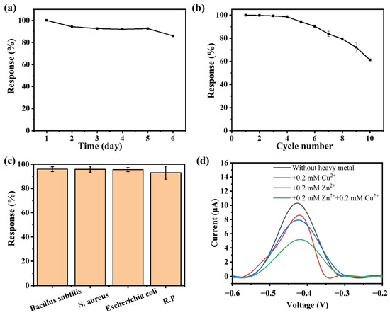 Long-term stability (a) and reusability stability (b) of the bioelectric activity sensor, (the concentration of Cu2+ used is 0.05 mM); (c) The impact of microbial contamination on the sensor; (d) Detection results of the sensor for both Cu2+ and Zn2+.