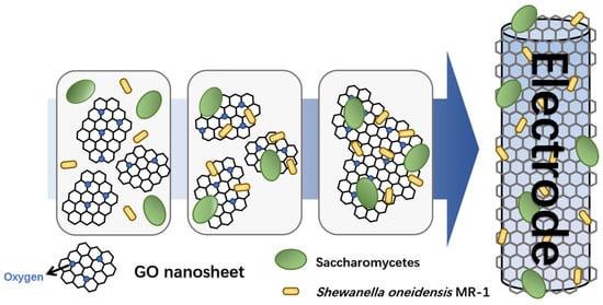 Take appropriate volumes of Shewanella and yeast broth with a final OD600 of 3 into centrifuge tubes. Centrifuge at 5000 rpm for 5 min, discard the supernatant, washed three times with sterile water, and resuspend the bacterial cells in 500 mL of culture medium (16.95 g/L Na2HPO4·12H2O, 2.85 g/L KH2PO4, 0.95 g/L NaCl, 0.975 g/L NH4Cl, 1 g/L tryptone, 0.5 g/L yeast extract, 0.1 mol/L CaCl2, 1 mol/L MgSO4·7H2O). Preparing a graphene hydrogel solution by adding 250 mL of GO and 250 mL of pure water, resulting in a final GO concentration of 1 mg/mL in the system. The bacterial suspension was adjusted to a final OD600 = 3 in the 1 mL system (500 µL concentrated culture + 250 µL GO + 250 µL water). The required volume of pre-culture was calculated based on its measured OD600 (X) using: V₁ = (3 × 1000 µL)/X. After centrifugation (5000 rpm, 5 min) of V₁ volume, the pellet was resuspended in 500 µL fresh medium to achieve the target OD600. Inject 60 mL of the hydrogel solution into a capillary. Placing a titanium wire of suitable length into the capillary as the working electrode, secure the titanium wire with parafilm, and incubate at 30 °C for 20–24 h to form the graphene hydrogel.