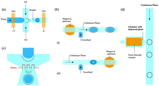 Droplet generation by active methods. (a) Droplet generation by applying a direct current voltage [83]. (b) T-junction device with ferrofluid and magnet at (i) the upstream position and (ii) the downstream position [83]. (c) Schematic representation of the microfluidic device designed to study the temperature dependence of the droplet formation process [83]. (d) Microfluidic chip for on-demand droplet dispensing: a piezoelectric actuator releases aqueous droplets into a vertical channel with immiscible fluid [83].