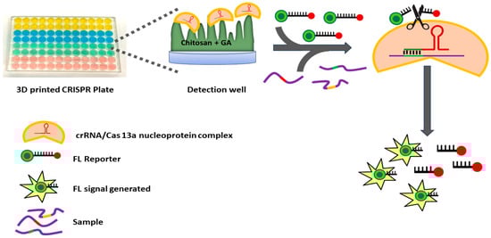As shown in Figure 2, to each microwell 50 µL 0.5 mg/mL chitosan in 0.05 M HCl was added and incubated at room temperature for 3 h. Solution was removed by tapping the plate upside down, then it was left to dry overnight in a vacuum to provide hydrogel coats in each microwell. Then, wells were filled with 3% glutaraldehyde and incubated 1 h. to form Schiff’s bases between amines on chitosan and glutaraldehyde [43]. Excess solution was drained by inverting the plate and tapping, followed by vacuum drying 1 h. Separate microwells were then reacted with crRNA/Cas13a nucleoprotein complex of miRNAs 30e-5p, miRNA34c-5p, and miRNA 200c-3p. Cas13a/crRNA/nucleoprotein complex mixtures were prepared by mixing 400 mM Tris-HCl buffer (5 µL), ultrapure water (35 µL), Cas13a (63.3 µg/mL) (5 µL), SUPERase•In RNase Inhibitor (2.5 µL), and the appropriate CRISPR RNA (crRNA) (2.5 µg/mL) (2.5 µL), and incubating for 12 min. at 37 °C. The required Cas 13a/crRNA (50 µL) were then added to their respective wells and incubated overnight at 4 °C. This process facilitates a reaction between free glutaraldehyde and amines on the Cas13a protein in the mixture with the chitosan hydrogel already chemisorbed in the wells. The quantification of immobilized Cas13a in the microwells was carried out using the Bicinchoninic Acid (BCA) total protein assay [44], revealing 37 × 1011 Cas13a molecules/well. Excess crRNA/Cas13a was removed by tap drying, and washed with pH 7.5 (400 mM) Tris-HCl buffer. The reaction mixture contained 400 mM Tris-HCl (5 µL), RNase-free H2O (38.25 µL), SUPERase•In RNase Inhibitor (1.25 µL), RNaseAlert reporter (2 µM) (2.5 µL), pooled human plasma (0.5 µL), and the respective target miRNA sample (2.5 µL) (total 50 μL per well based on the optimum volume for best assay performance, as shown in Figure S1), were kept in microcentrifuge tubes in an ice bath while preparing to add them to wells.