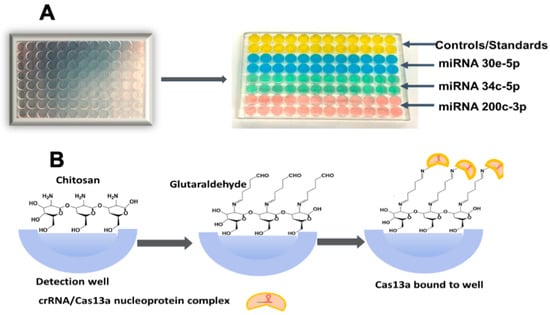 Three-dimensional-printed polyacrylate plates for multiplexed CRISPR miRNA assay: (A) 96-well microfluidic CRISPR plate with 50 uL vol. microwells (on left), and analytical CRISPR plate after immobilizing the desired crRNA/Cas13a’s in the wells. (B) Binding of Cas13 into wells by chemical attachment to chemisorbed chitosan hydrogel.