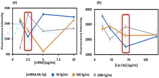 The assay was designed to be conducted in 3D-printed 96-well plates with individual crRNA/Cas13a’s chemically bound to chemisorbed chitosan in each well. CrRNA optimization was carried out by testing concentrations of the miRNA in the range of 1–10 μg/mL with maximum Cas13a (127 μg/mL) to maximize signal separation, e.g., shown for miRNA30e-5p detection (Figure 3a) [20,41]. The best crRNA was selected for each of the analyte miRNAs, as the value that provided increased fluorescence from low to high values in the correct order. This crRNA level was then used to optimize Cas13a (range 16–127 μg/mL) using the same criteria (Figure 3b).
