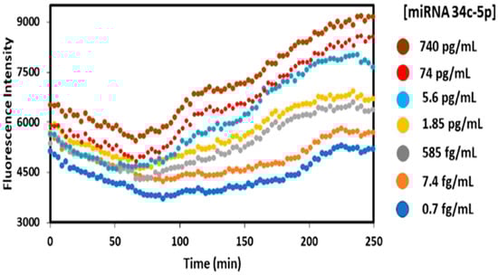 Fluorescence plate reader measurement using 490 and 520 nm as excitation and emission wavelengths for different concentrations of miRNA 34c-5p at 37 °C. For calibrations and sample analyses, emission intensity was measured after subtracting the plateau readings (90–100 min) from exponential phase points (140–150 min). All concentration-dependent signals were baseline-corrected by subtracting the corresponding control signal.
