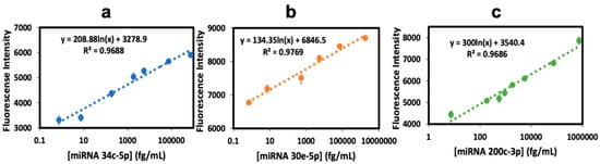 Calibration plots in 0.1% pooled human plasma using the fluorescence plate for simultaneous fluorescent detection of (a) miRNA 34c-5p, (b) miRNA 30e-5p, and (c) miRNA 200c-3p (error bars: SD for n = 3).