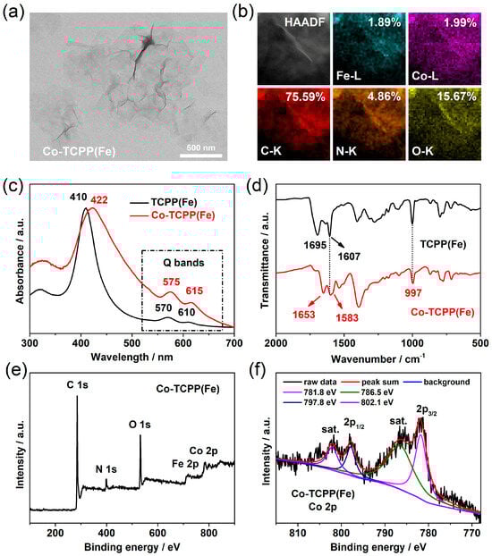 (a) TEM image, (b) elemental mapping, (c) UV-vis absorption, (d) FT-IR spectra, (e) full XPS, and (f) Co 2p spectra of the prepared Co-TCPP(Fe) MOF materials.