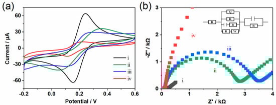 (a) CV plot and (b) EIS plot obtained in a 5.0 mM K3[Fe(CN)6]/K4[Fe(CN)6] solution containing 0.1 M KCl, where the scanning rate is 50 mV s−1. (i) GCE, (ii) Co-TCPP(Fe)/GCE, (iii) Co-TCPP(Fe)/rGO/GCE, and (iv) Co-TCPP(Fe)/rGO/Nafion/GCE.