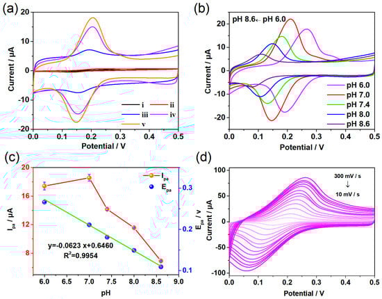 CV plots obtained in a 0.1 M PBS containing 50 µM DA, where the scanning rate is 50 mV s−1. (a) The different electrodes: (i) GCE, (ii) Co-TCPP(Fe)/GCE, (iii) rGO/GCE, (iv) Co-TCPP(Fe)/rGO/GCE, and (v) Co-TCPP(Fe)/rGO/Nafion/GCE. (b) CV results of the Co-TCPP(Fe)/rGO/Nafion/GCE at different pH, and (c) the changes of anode peak current Ipa and anode peak potential Epa. (d) CV results of the Co-TCPP(Fe)/rGO/Nafion/GCE at different scan rates.
