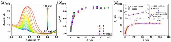 Since the Co-TCPP(Fe)/rGO/Nafion-modified electrode can produce better electrochemical behavior, the electrochemical detection range and detection limit of the composite material for DA were analyzed. As shown in Figure 4a, the oxidation peak current of DA in the concentration range of 0.1–100 µM on the Co-TCPP(Fe)/rGO/Nafion-modified electrode was determined by the DPV method, and its intensity showed a regular increase with the enhancement of DA concentration. Moreover, the results of different electrodes constructed by the same method all have the same growth trend (Figure 4b), indicating that the Co-TCPP(Fe)/rGO/Nafion material has extremely high stability and repeatability in electrochemical detection. Based on the results of several electrochemical tests, the linear regression equations were y = 27.02 + 10.58x, y = 35.28 + 4.23x, and y = 85.96 + 0.08x in the concentration ranges of 0.1–1.0 µM, 2.0–10 µM, and 30–100 µM, respectively (Figure 4c). Furthermore, the detection limit obtained based on a signal-to-noise ratio of 3 is 0.014 µM, which is superior to most other reported composite materials (Table 1). The reason may be that the ultrathin MOF material with a two-dimensional structure constructed by porphyrin not only has a large specific surface area but also a macrocyclic conjugated structure of its organic molecules, thus providing a rich electron cloud that can adsorb DA with an aromatic ring structure through π-π stacking interaction. Moreover, the carboxyl groups of the MOF material and the oxygen-containing groups carried by rGO can also form electrostatic attraction interactions with the amino groups of DA, further promoting the enrichment of DA on the electrode surface. Of course, the excellent electron transfer function of rGO in this composite material is also an indispensable factor.