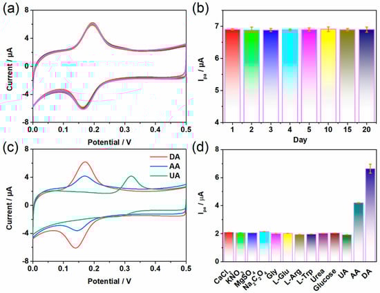 (a) CV curves of Co-TCPP(Fe)/rGO/Nafion/GCE after 30 cycles at 5 µM DA. (b) Peak current response obtained by the Co-TCPP(Fe)/rGO/Nafion/GCE sensor constructed by the same method under multiple tests at 5 µM DA. CV diagrams of 5 µM DA in the presence of 250 µM of other interfering substances (c) UA and AA, and (d) CaCl2, KNO3, MgSO4, Na2C2O4, Gly, L-Glu, L-Arg, L-Trp, Urea, and Glucose.