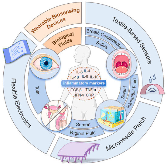Sweat is the fluid secreted by sweat glands following neurotransmitter stimulation, reaching the skin’s surface through dermal ducts [47]. Studies have shown that several inflammatory markers, including IL-1β, IL-6, IL-8, TNF-α, IFN-γ, CRP, IL-10, and TGF-β, are also expressed in human sweat, with their temporal kinetics mimicking their expression in human serum [19,48,49]. Consequently, sweat has the potential to serve as a surrogate for systemic inflammatory status reflected in blood responses. However, there are some inconsistencies in the results of multiple reports on cytokine levels in sweat. As demonstrated by Dai et al. [50], a large amount of IL-1β was detected in sweat samples collected from the arms of 11 healthy volunteers, but no IL-6 or TNF-α was detected, and only low levels of IL-8 were detected in 3 out of 11 samples. However, other studies have shown that IL-1β, IL-6, IL-8, and TNF-α are all detected in sweat glands [48,49]. The deviation of this result may be related to the accuracy of the detection instrument or the location of sweat extraction [50]. However, there is currently no further research to clarify the status of these cytokines in sweat.