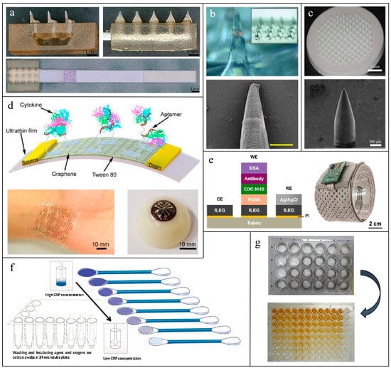 Several common representatives of non-invasive or minimally invasive biosensing devices for inflammation monitoring: Microneedle patch: (a) A hollow microneedle-lateral flow assay device for CRP monitoring in skin ISF [98]; (b) an encoded solid Microneedle Arrays for TNF-α, IL-1β and IL-6 detection in skin ISF [99]; (c) an antigen-modified porous microneedles for protein detection in skin ISF [100]. Flexible electronics: (d) A regenerative aptameric graphene-Nafion biosensor for IFN-γ monitoring in sweat [101];, (e) a laser-engraved graphene on fabrics for TNF-α monitoring in sweat [102]. Textile-Based sensors: (f) A TMB stained cotton swab for CRP detection in biofluids [103]; (g) antigen-modified electrospun nanofibers for CRP detection in biofluids [103].