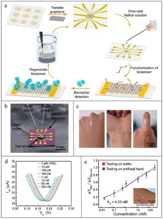 Workflow of GNFET for CRP detection [136]: (a) Illustration of the fabrication, detection, and regenerative process of the GNFET biosensor; (b) photograph of the GNFET biosensor for biomarker detection; (c) photograph of the highly flexible biosensor conformably mounted on the human hand; (d) transfer characteristic curves measured when the biosensor was exposed to various IFN-γ concentrations in undiluted sweat; (e) and detection of various IFN-γ concentrations in artificial human hand sweat.