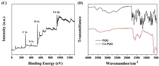 SEM photograph (A), size distribution (B), XPS survey (C), and FT-IR spectrum (D) of Cu-PQQ nanoparticles.