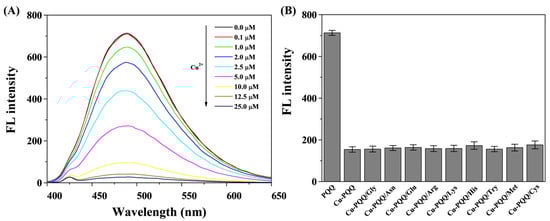 (A) The fluorescence spectra of 5 μM PQQ in the absence and presence of different concentrations of Cu2+. (B) The fluorescence intensity of 0.01 mg/mL Cu-PQQ nanoparticles in the absence and presence of various amino acids at a concentration of 50 μM. The excitation wavelength was 340 nm.