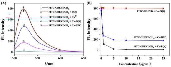 (A) The fluorescence spectra of 1 μM FITC-GDEVDGH6 in the absence (curve 1) and presence of PQQ (curve 2), Cu2+ (curve 3), 10 μg/mL Cu-PQQ nanoparticles (curve 4), and 10 μg/mL Cu-BTC MOFs (curve 5). (B) The effect of Cu-PQQ and Cu-BTC dosage on the fluorescence intensity of an FITC-labeled peptide.