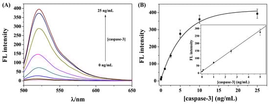 (A) Fluorescence spectra and (B) calibration plots for the detection of different concentrations of caspase-3 (0, 0.01, 0.1, 1, 2.5, 5, 10, and 25 ng/mL). The inset in panel (B) shows the linear portion of the fitting curve.
