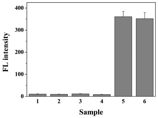 Selectivity is an important issue in assessing the performance of analytical methods. The selectivity of the nanoprobe for caspase-3 detection was examined by challenging it with serum protein BSA and three non-specific proteases (trypsin, PSA, and β-secretase). As shown in Figure 5, no obvious increase in the fluorescence intensity was observed for the tested interferences (bars 1~4). In addition, there is no significant difference in the fluorescence intensity for the detection of caspase-3 in the absence and presence of the tested interfering species (bars 5~6). This indicated that the peptide probe was attached onto the nanoquencher surface with a high degree of stability, and it could not be replaced by the interfering proteins. We have also found that metal ions in biological systems (e.g., Ca2+, Mg2+, Fe2+, Zn2+, and Co3+) did not induce significant changes in the fluorescence intensity of nanoprobes (Figure S3). The good selectivity of this method could be attributed to the high specificity of caspase-3 toward the substrate, the strong coordination interaction between His6 tags and metal ions, and the negligible quenching effect of Cu-PQQ on the released FITC-included segment.