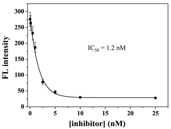 Given that caspase-3 is believed to be a credible target for the treatment of apoptosis-related diseases, the screening of its inhibitors is of great importance to the pharmaceutical industry. In this work, DEVD-FMK was selected as a model inhibitor to prove the feasibility of this method for screening potential inhibitors. Caspase-3 (5 ng/mL) was treated with different concentrations of DEVD-FMK and then analyzed by the proposed nanoprobe. As presented in Figure 6, the fluorescence intensity decreased gradually with the increase in DEVD-FMK concentration. This result indicates that inhibiting the activity of caspase-3 by DEVD-FMK could effectively prevent the cleavage of a peptide substrate, thus limiting the release of a FITC-included segment from the nanoquencher surface. The half-maximum inhibition value (IC50) was estimated to be 1.2 nM, which is consistent with that found by other assays [70,71]. Therefore, the method shows great potential in the rapid and high-throughput screening of drugs to inhibit protease activity.