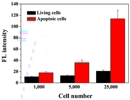 Caspase-3 is considered to be a key enzyme for the execution of cell apoptosis. Therefore, the sensitive detection of caspase-3 is of great importance for the diagnosis and prognosis of apoptosis-relative diseases. In order to evaluate the feasibility of this method for application in biological systems, the activity of caspase-3 in living and apoptotic cancer cells was determined. STS was used as the inducer to induce the apoptosis of HeLa cells, and then the lysates were extracted for in vitro assays of caspase-3. There was no significant fluorescence recovery when the nanoprobe was incubated with the lysate extracted from the living cells (black bars) (Figure 7). However, the fluorescence intensity was greatly intensified for the lysate extracted from the apoptotic cells (red bars), and the value was obviously higher than that of the living cells. We also found that the addition of inhibitor DEVD-FMK to the lysate extracted from the apoptotic cells could limit the fluorescence enhancement, indicating that caspase-3 was activated during the apoptosis of HeLa cells and the method showed high specificity for the assay of active caspase-3.