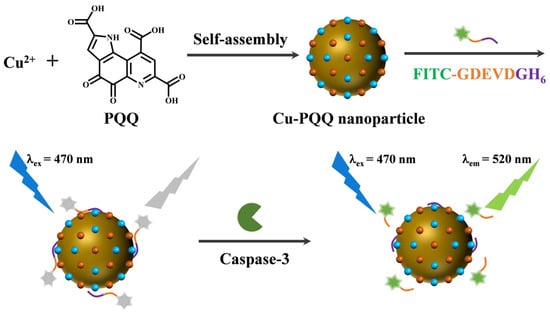 Schematic illustration of the fluorescent biosensor for caspase-3 detection with the Cu-PQQ nanoparticle as the nanoquencher.