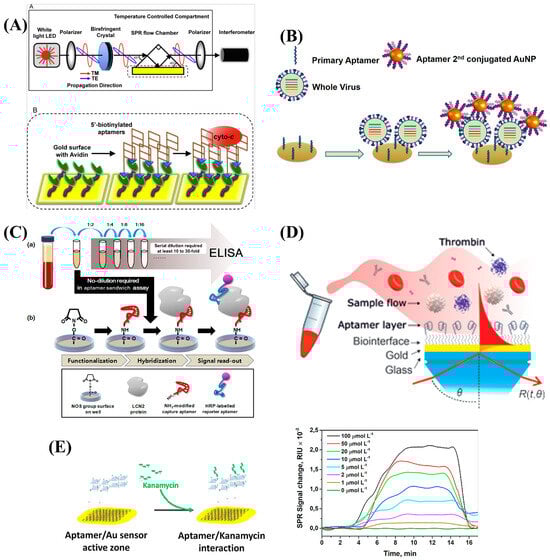 Some examples of SPR aptasensor applications in drug screening and infectious pathogen, disease biomarker, and small-molecule detection. (A) An SPR aptasensor for anti-cancer drug screening. Reproduced with permission from ref. [91]. Copyright 2014, Elsevier B.V. (B) A dual-aptamer SPR biosensor of whole avian flu virus with gold nanoparticle conjugation for signal amplification. Reproduced with permission from ref. [67]. Copyright 2016 Elsevier B.V. (C) A sandwich detection-based SPR aptasensor designed for sandwich immunoassay for Hepatocellular Carcinoma diagnosis [92]. (D) An SPR aptasensor for thrombin detection in human blood. Reproduced with permission from ref. [80]. Copyright 2020, Elsevier B.V. (E) Kanamycin residues detection in food by an SPR aptasensor. Reproduced with permission from ref. [60]. Copyright 2021 Elsevier B.V.