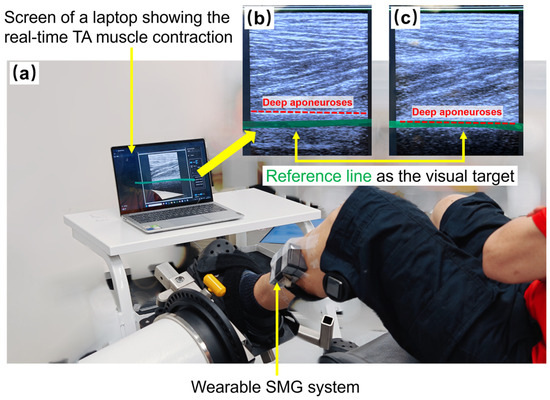 Experimental setup of ultrasound-imaging-based visual feedback (UVF) muscle training. (a) Placement of wearable ultrasound probe and display for UVF; (b) an example of the captured ultrasound image showing the TA muscle during resting phase; (c) an example of the captured ultrasound image showing the TA muscle during isometric contraction. Note: SMG—sonomyography; TA—tibialis anterior.