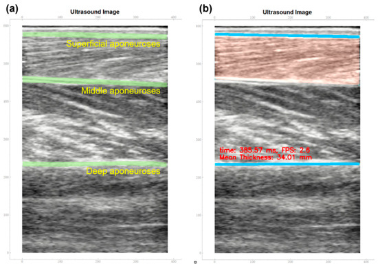 All the captured ultrasound images were analyzed and labeled by the same experienced researcher (with over eight years of expertise in medical ultrasound imaging). When necessary, the algorithm’s automated myofascial boundary identification function could and would be manually overwritten by the same researcher to maintain measurement accuracy and reliability.