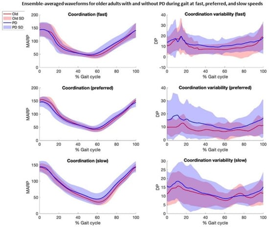 Ensemble-averaged waveforms +/− 1 standard deviation (SD) for older adults with and without Parkinson’s disease (PD) during gait at fast, preferred, and slow speeds. Waveforms depict hip–knee coordination (Mean Absolute Relative Phase, MARP) and hip–knee coordination variability (Deviation Phase, DP). Red line represents older adults, and blue line represents adults with PD. Shaded areas represent SD.
