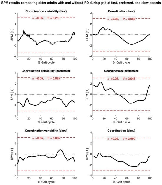 To test the hypothesis that pwPD would have a more in-phase (smaller MARP) and less variable (lower DP) hip–knee coordination strategy, statistical parametric mapping (SPM) was used [31]. Two-tailed independent sample t-tests (spm1d.stats.ttest2) or the non-parametric equivalent (spm1d.stats.nonparam.ttest2) compared the pre-processed time series data of the entire gait cycle for the MARP and DP, in pwPD and HOAs, at three different speeds (slow, preferred, fast). Statistical significance was set at α = 0.05.