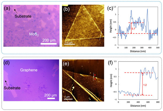 Optical images and AFM of MoS2 and graphene: (a) a CVD-grown MoS2 on a Si/SiO2 substrate, (b) an AFM image of a MoS2 flake with (c) its height profile, and (d) graphene synthesized via CVD on a Si/SiO2 substrate, along with (e) its AFM image and (f) the corresponding height profile.