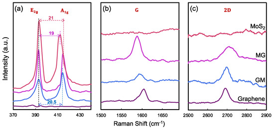 Following the synthesis of each material separately, the heterostructures were subsequently constructed through physical stacking by capping graphene with MoS2 (in which MoS2 is underneath graphene, shortened to MoS2/Graphene or MG as illustrated in Figure 1a), and capping MoS2 with graphene (in which graphene is underneath MoS2, shortened to Graphene/MoS2 or GM as illustrated in Figure 1b). Raman spectroscopy confirmed that the intrinsic properties of both materials remained intact post-transfer, ensuring their quality and compatibility within the heterostructure. The blueshift of A1g mode (Figure 3a) in both MG and GM heterostructures indicates the existence of a Van der Waals interaction at the interface [29,30]. Figure 3b compares the G band of graphene in all cases. The G peak position shows a much larger shift of the GM compared with the case of MG. The possible reason is that graphene becomes more sensitive when it is in contact with different bottom and top dielectric environments [29,30]. Since the measured Raman G peak position shifts ΔΩG linearly with Fermi energy change ΔEF, ΔΩG = |ΔEF| × 42 cm−1 eV−1 [30,31]. The large shift of the G band is the result of the stacking order and intimate interface. The stacking of MoS2 on graphene leads to a much larger shift of the graphene G band, compared with the case of graphene on MoS2. For MG, G peaks downshift for 16 cm−1, corresponding to a Fermi level shift of 0.38 eV in graphene due to contact with MoS2, i.e., electron transfer from MoS2 to graphene lifts the graphene Fermi level by 0.38 eV; while for GM, G peaks downshift for 8 cm−1, reflecting a Fermi level shift of 0.19 eV in graphene due to contact with MoS2, i.e., electron transfer from MoS2 to graphene lifts the graphene Fermi level by 0.19 eV. The possible reason is that graphene becomes more sensitive when it is in contact with different bottom and/or top dielectric environments [29,30]. The positions of the 2D peaks were also a function of doping, as shown in Figure 3c, where both heterostructures’ 2D peak show blueshift, which means interaction within both heterostructures results in the doping of the graphene layer [9,32]. The 2D peak upshifts by 55 cm−1 for MG and the 2D peak upshifts by 45 cm−1 for GM, and the doping in MG is stronger than the doping in the GM structure.