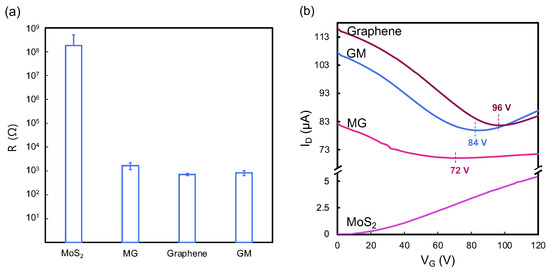 (a) Resistance results and (b) representative transfer curve of MoS2, graphene, and MG and GM heterostructures.