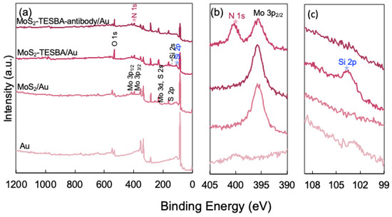 To determine the chemical composition of MoS2 modified with TESBA, XPS spectral analysis was conducted on gold substrate. The wide-scan spectra of both MoS2/Au, MoS2–TESBA/Au, and MoS2–TESBA–antibody/Au as shown in Figure 5a, reveal the presence of Mo, S, C, and O elements. These elements are observed in the MoS2/Au, MoS2–TESBA/Au, and MoS2–TESBA–antibody/Au samples. Notably, the Si element is detected in the MoS2–TESBA sample (as detailed in Figure 5c), confirming the successful incorporation of TESBA onto the MoS2 surface. The increase in the O 1s signal further indicates that TESBA molecules are crosslinked, as evidenced by the presence of Si–O–Si bonding on the surface. Since TESBA is the sole source of both silicon and oxygen, these signals serve as reliable indicators of its presence and the degree of crosslinking density [14]. Furthermore, a significant increase in the N 1s peak intensity (Figure 5b) is observed on the MoS2–TESBA–Antibody/Au surface, which is attributed to the immobilization of antibodies. This enhancement in the N signal reflects the abundance of nitrogen-containing peptide bonds in the antibody molecules, thereby confirming successful biofunctionalization of the surface [33]. The peak observed at 401 eV could be an overlap between N1s and Mo 3p.