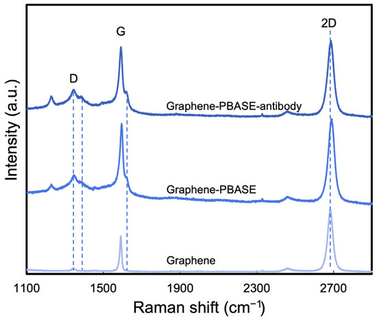 Raman spectra of bare graphene, PBASE-functionalized graphene, and antibody-immobilized graphene.