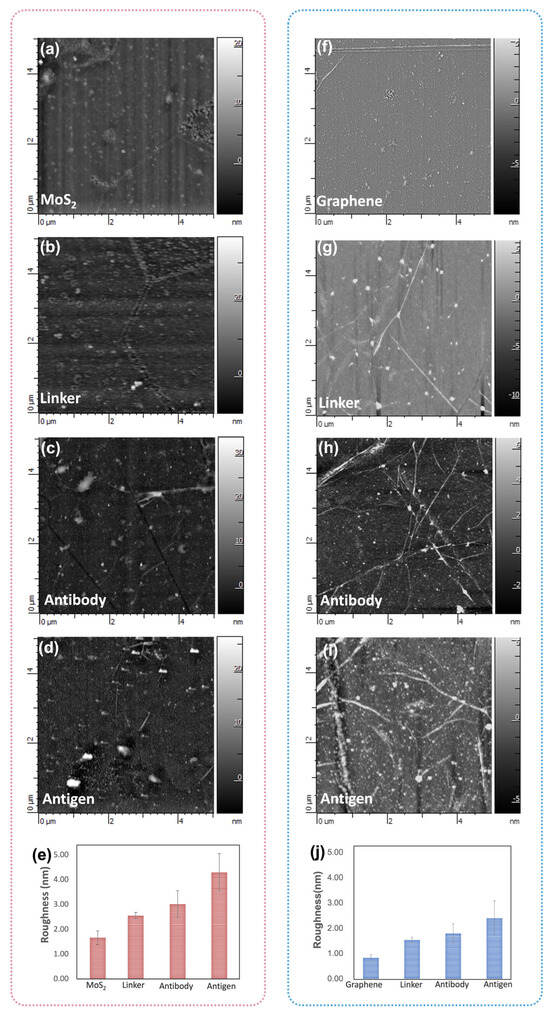 The AFM image of (a) bare MoS2, (b) TESBA conjunctions, (c) after antibody immobilization, and (d) after antigen attachment of the MoS2 surface. (e) The RMS roughness changes of the MoS2 surface functionalization process. The image of (f) bare graphene, (g) PBASE conjunctions, (h) after antibody immobilization, and (i) after antigen attachment of the graphene surface. (j) The RMS roughness changes of the graphene surface functionalization process. AFM images were obtained within a 5 μm × 5 μm area.