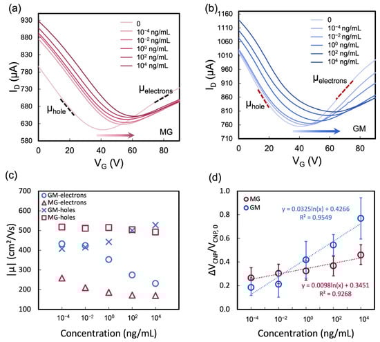 Transfer curves of the two heterostructures biosensors were obtained to detect varying concentrations of HIgG analyte. The sensing properties were assessed through the shift in the VCNP, which is defined as ΔVCNP = VCNP − VCNP0, where VCNP0 and VCNP are the charge neutrality point before and after the addition of the target. As with most ambient-condition electrical measurements in 2D materials, the influence of surface adsorbates cannot be entirely excluded, though relative trends remain consistent. Upon introduction of a low HIgG concentration (10−4 ng/mL), a discernible rightward shift was observed for both MG (Figure 8a) and GM (Figure 8b) heterostructure biosensors coupled with a decrease in the overall current level. At higher HIgG concentrations, the transfer curves exhibited further rightward shifts, and the VCNP values increased accordingly. These shifts and the current changes suggest that HIgG binding to the functionalized heterostructure surface results in changes to the local charge environment. The interaction of HIgG with the biosensor’s surface receptors leads to an alteration in the electrostatic environment of the heterostructure surface, impacting charge carrier distribution. These changes are sensitively detected by the FET, which reflects them as variations in carrier mobility. Specifically, the binding event can lead to a change in the carrier mobility, which can be calculated from the linear region of the transfer curves for each analyte concentration and summarized in Figure 8c. The mobility (μ) of charge carriers in a FET was calculated using the following equation [37]: