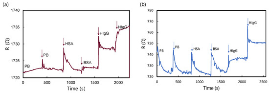 R-t measurement of (a) MG biosensor and (b) GM biosensor upon the addition of different biomolecular solutions. All analyte solutions prepared in 10 mM PB consisted of 102 ng/mL of HSA, 102 ng/mL of BSA, 102 ng/mL, and 104 ng/mL of HIgG.