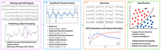 In more detail, different amplitude transformation techniques, based on min-max normalization and standardization, were applied to EEG signals from patients with AD and HS. The impact of this transformation on AD detection was evaluated by extracting MFE as features and employing it in a binary classification task to distinguish between HS and AD using SVM, RF, and KNN. The robustness and general applicability of the proposed preprocessing techniques have been validated using two distinct, publicly available EEG datasets.