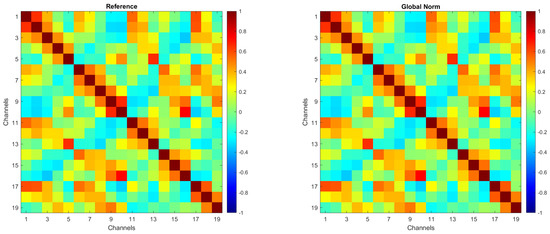 For the sake of brevity, Figure 2 presents the correlation matrices for the Reference and Global Norm conditions. These matrices were obtained by averaging the correlation matrices from 104 individual subjects. Each matrix illustrates the correlation between EEG channels, with the color scale indicating the degree of correlation, ranging from −1 (negative correlation) to +1 (positive correlation). As shown, inter-channel correlations remain unchanged following the amplitude transformation.