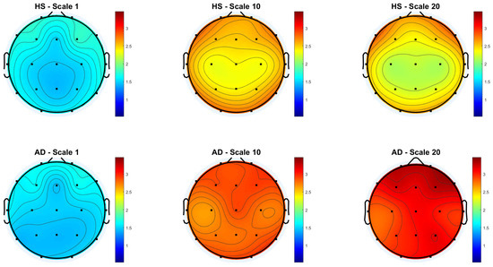 Figure 3 and Figure 4 show the scalp topography of MFE mean values across 19 EEG channels under the Reference and Global Norm conditions, respectively, for HS (top row) and AD (bottom row) at three representative temporal scales (scale 1, 10, and 20), chosen for clarity. Under the Reference condition, both groups show similar low MFE values at scale 1. At scale 10, MFE values increase in both groups, more diffusely in AD. At scale 20, MFE values decrease in HS data, particularly in central and temporal regions, while they continue to rise in AD data, suggesting higher complexity. In the Global Norm condition, this trend is accentuated: AD shows a stronger and more widespread increase in MFE with scale, especially at scale 20, where differences between groups become more evident. Overall, MFE increases more consistently across scales in AD, highlighting group separation more clearly with normalization.